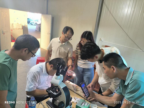 邓教授当天就带领科研团队一行深入尤溪县洋中后楼村兰香家庭农场毛木耳种植基地,对问题菌棒进行现场查看与细致诊断,发现木耳耳基周围及菌棒表面存在白色水泡状颗粒,针对可能存在的虫害与杂菌交叉感染等复杂情况,他现场连线国家食用菌产业技术体系虫害防控岗位专家、江苏省农科院马林研究员进行远程会诊。马研究员结合其在食用菌虫害绿色防控领域的研究经验,初步判定危害由木耳卢西螨感染。为了进一步确认该危害是由于卢西螨感染所致,邓教授通过取样,在高清显微镜下观测到螨虫活动,处于卢西螨感染初期,并让农户亲自观察,最后给出精准防控措施:一是及时组织工人将带螨感染的菌棒进行清理,并作高温杀虫无害化处理,阻断隔离防止进一步扩散。二是对菇房、菇架、菌棒表面等进行全面淋水清洗,降低螨虫虫口基数。三是在地面喷洒高浓度石灰水进行消杀,保持清洁干净出菇空间,防止螨虫进一步滋生。