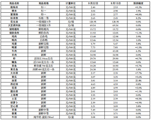 据9月22日价格监测,与上周一(9月15日,下同)相比,市区31种主副食品集超均价12跌10涨9平。其中: