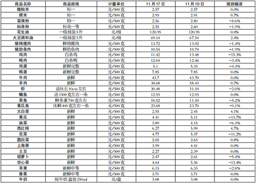 据11月17日价格监测,与上周一(11月3日,下同)相比,市区31种主副食品集超均价16跌6涨9平。其中: