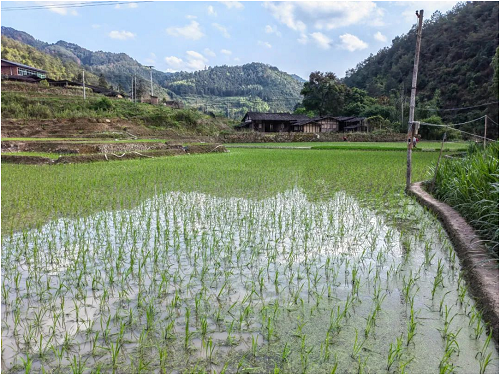 5月24日,在大田县文江镇温厝村的黑米种植户稻田里,文江镇农技干部陈占软正查看黑米秧苗长势情况,嘱咐村民近期因雨水较多,要时刻关注秧苗的生长变化。
