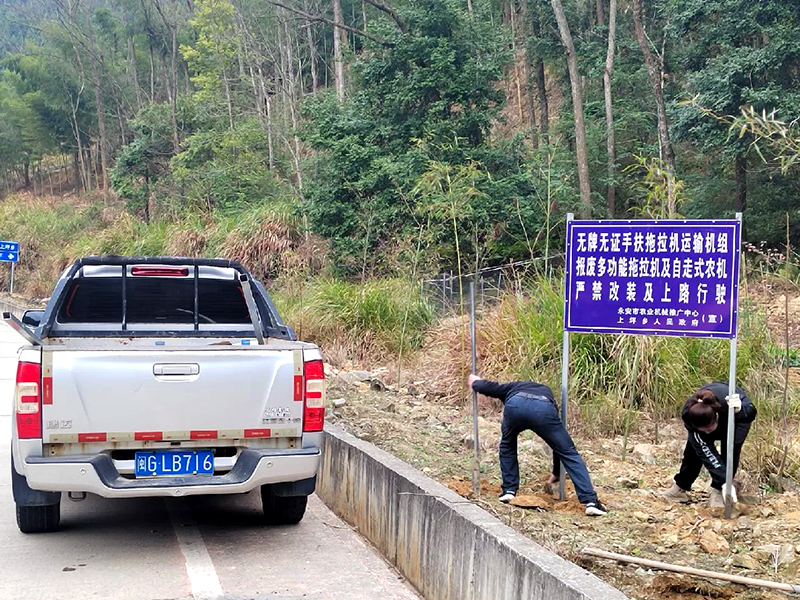 近日,永安市农业机械推广中心联合上坪乡人民政府,在上坪乡主干道沿线集中开展了农机安全警示标牌布设行动,旨在从源头防范山地轨道运输机、手扶拖拉机等农机违规载人、超载、非法改装等行为,守护群众生命财产安全。