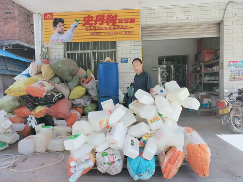 “以前打完药,瓶子袋子要么随手扔田埂,要么堆在角落,既不安全也污染环境。现在拿到回收点还能换些零花钱,真是一举两得!”城郊乡连屋村种粮大户老张提着一袋刚收集的农药瓶,在村里的“绿色农资”回收点高兴地说道。